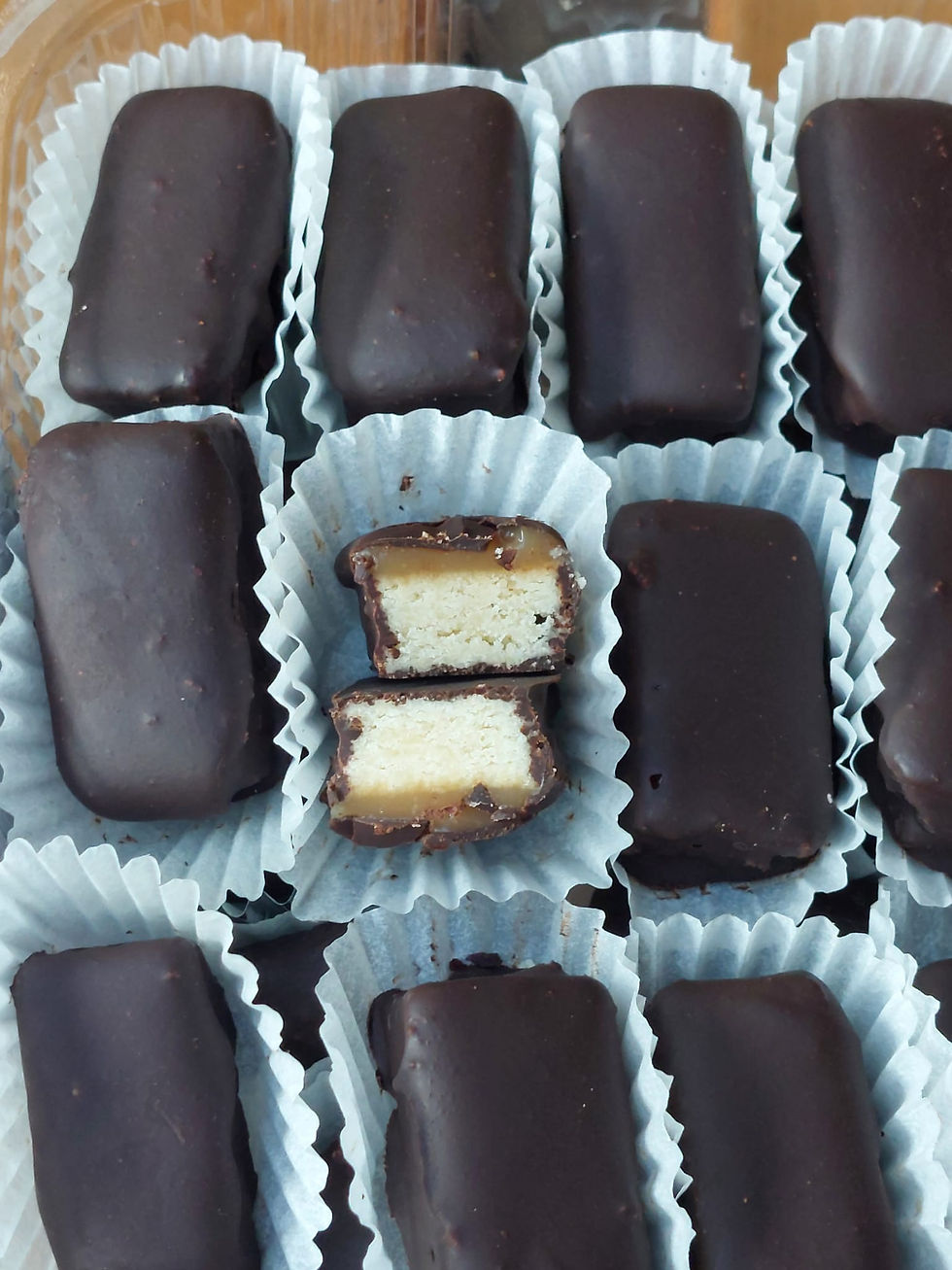 מוציאים את הבצק+הקרמל מהמקפיא וחותכים למקטעים שווים בגודלם, המהדרין יסירו גם את הקצוות לקבלת מראה מהוקצע יותר. הגודל שתחתכו תלוי רק בכם, אני אישית מעדיפה חיתוך לארבעה מלבנים לאורך ואז רוחביים בעובי ס"מ כדי לקבל מלבנים קצרים שנכנסים במנג'ט נייר. טוויקס מקורי ארוך פי 3 מכך.